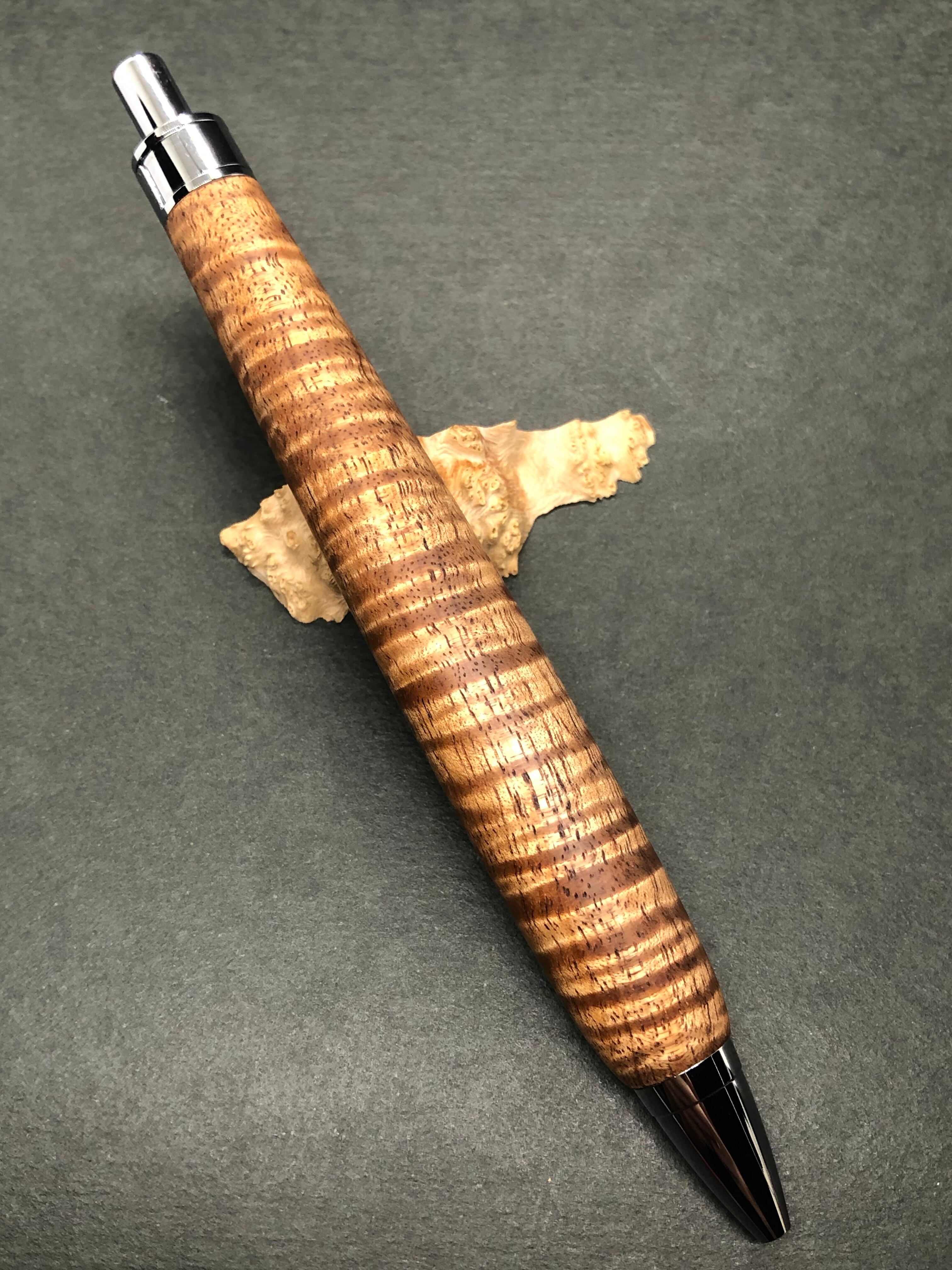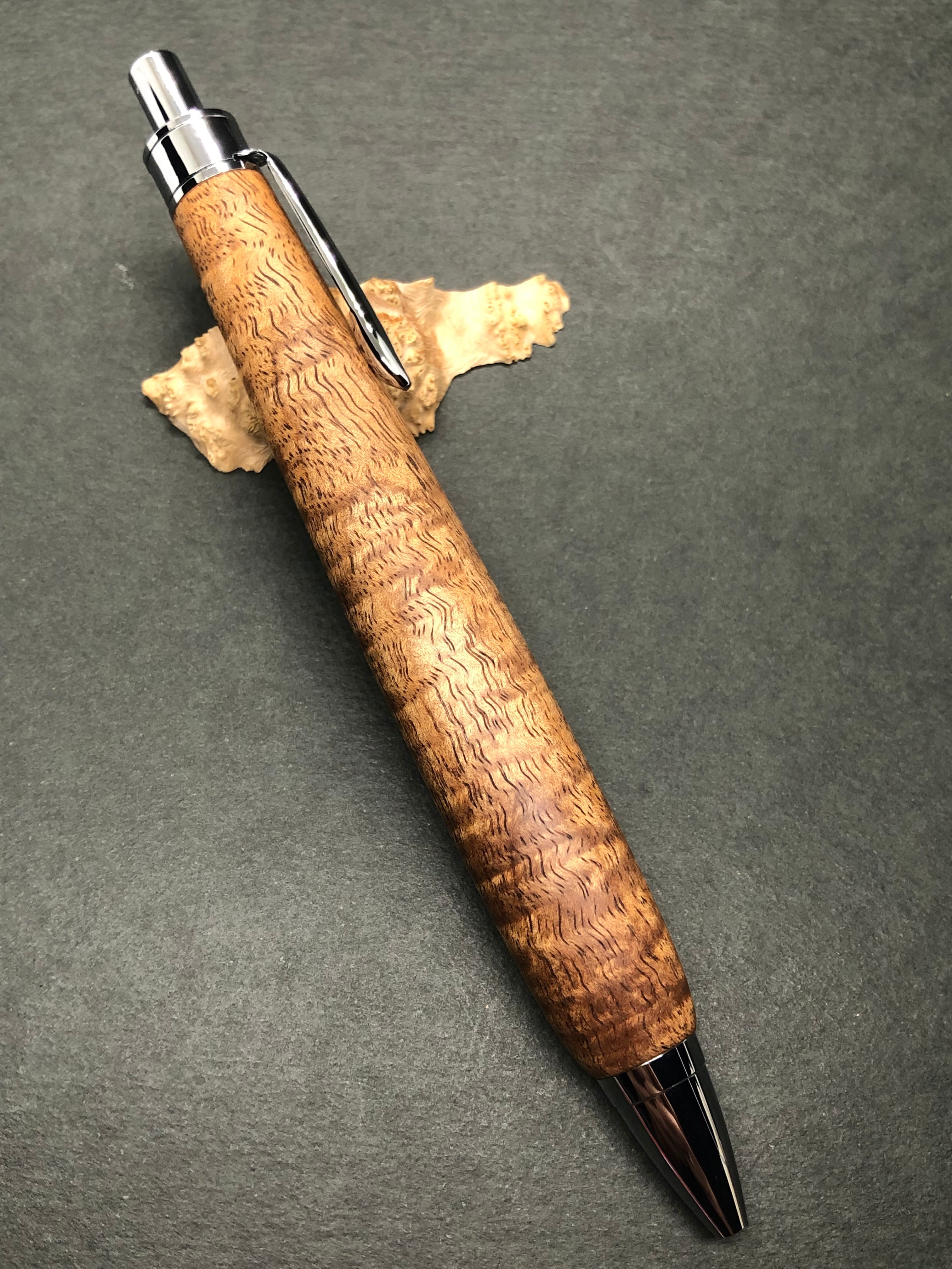 非常に深く、杢の間隔が狭い縮杢が入ったタスマニアンブラックウッドで制作したボールペンです。